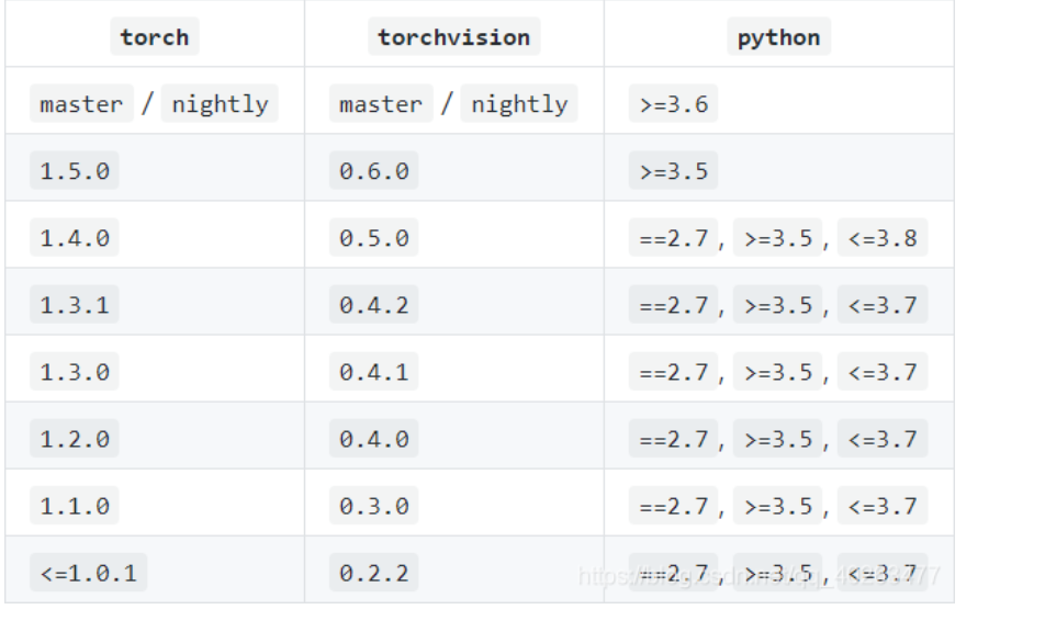 同时,你也需要知道pytorch与torchvision版本的对应关系(如下图,该图来源于后边参考链接,放于此处便于参考,如有侵权,联系删除),参考链接Pytorch和Torchvision版本对应_John's Blogs-CSDN博客_torch torchvision对应版本